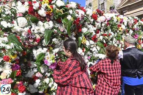Vibrante celebración con ofrenda floral a la Virgen del Pilar en un día soleado.