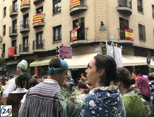 Vibrante celebración con ofrenda floral a la Virgen del Pilar en un día soleado.